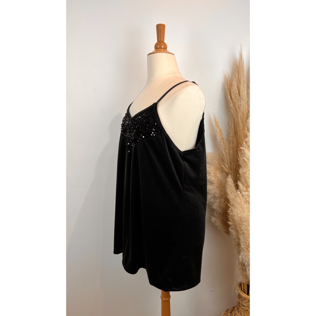 Brillez de mille feux lors de vos soirées grâce à notre top grande taille en velours et sequins, spécialement conçu pour sublimer toutes les silhouettes. Alliant l’élégance du velours doux à l’éclat raffiné des sequins scintillants, ce top est la pièce idéale pour être belle et lumineuse durant les fêtes.