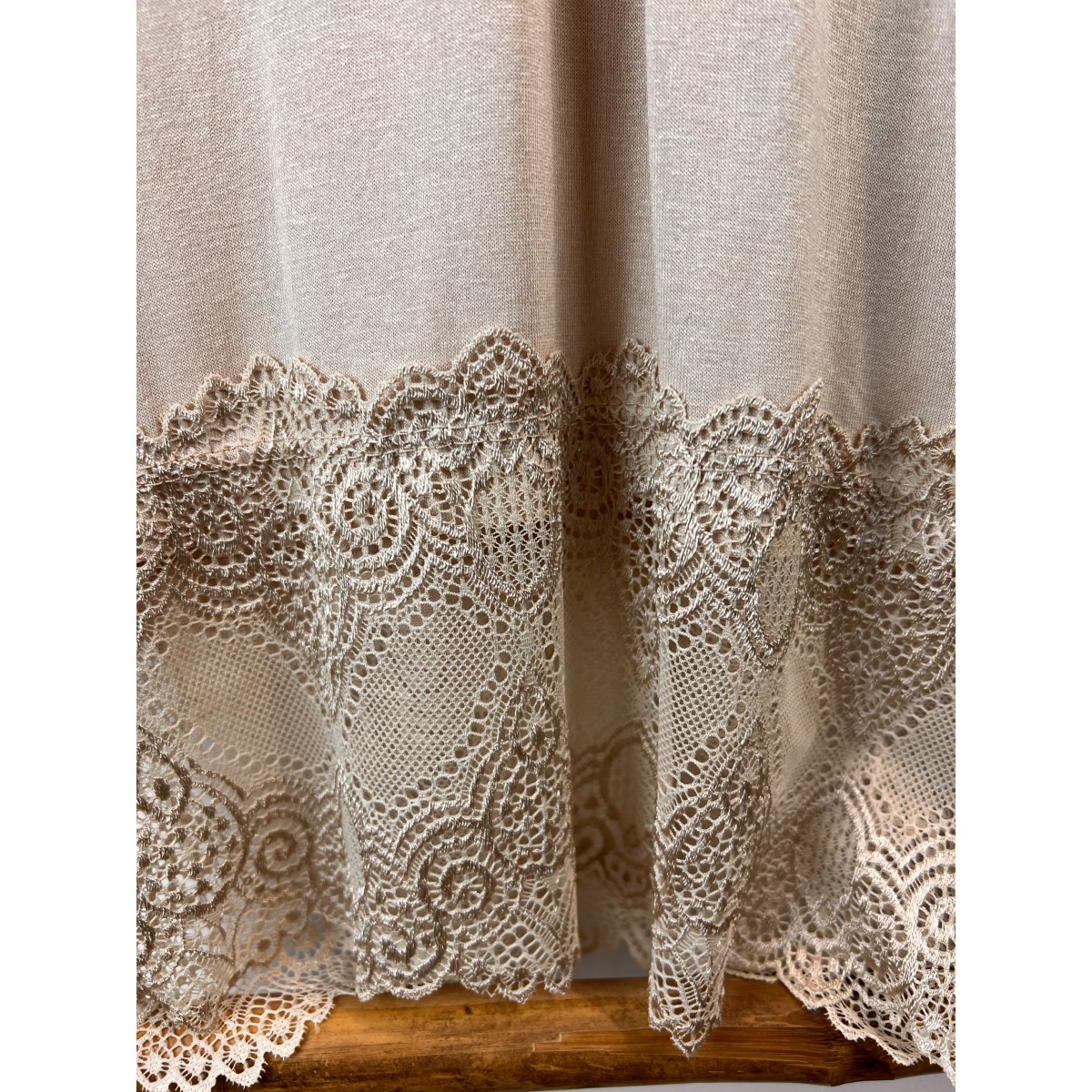 - Dentelle à l'encolure, aux bas des manches et dans le bas