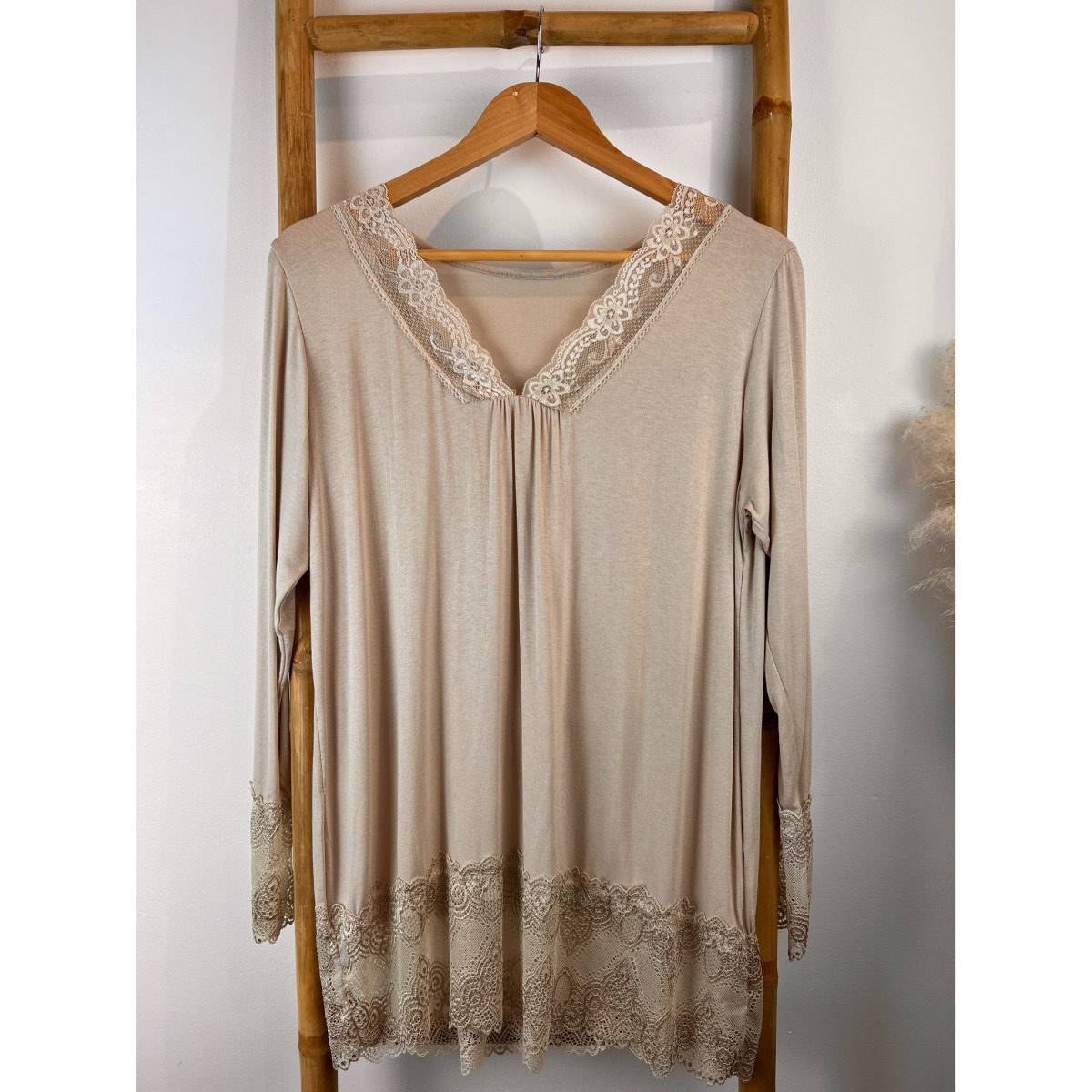 Sa matière fluide et extensible offre un confort agréable, tandis que les détails en dentelle délicate à l’encolure, aux manches et au bas apportent une touche raffinée. Disponible en beige ou en rouille, il se porte facilement pour sublimer un look du quotidien ou une tenue habillée.