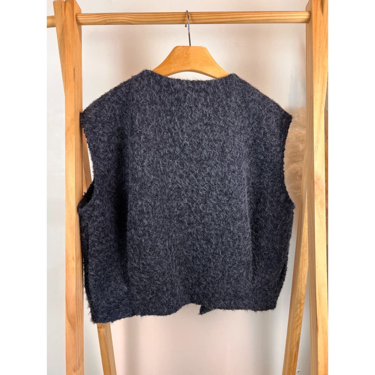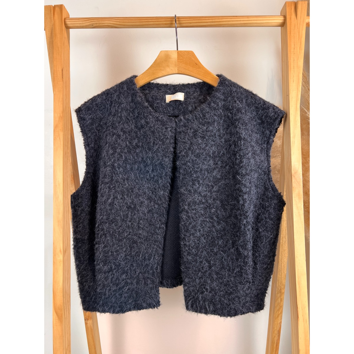 Cette veste chaude sans manches est idéale pour la mi-saison ou pour superposer lors des journées plus froides. Son aspect laine bouillie lui confère une allure naturelle et raffinée, tout en garantissant une belle tenue au fil du temps.